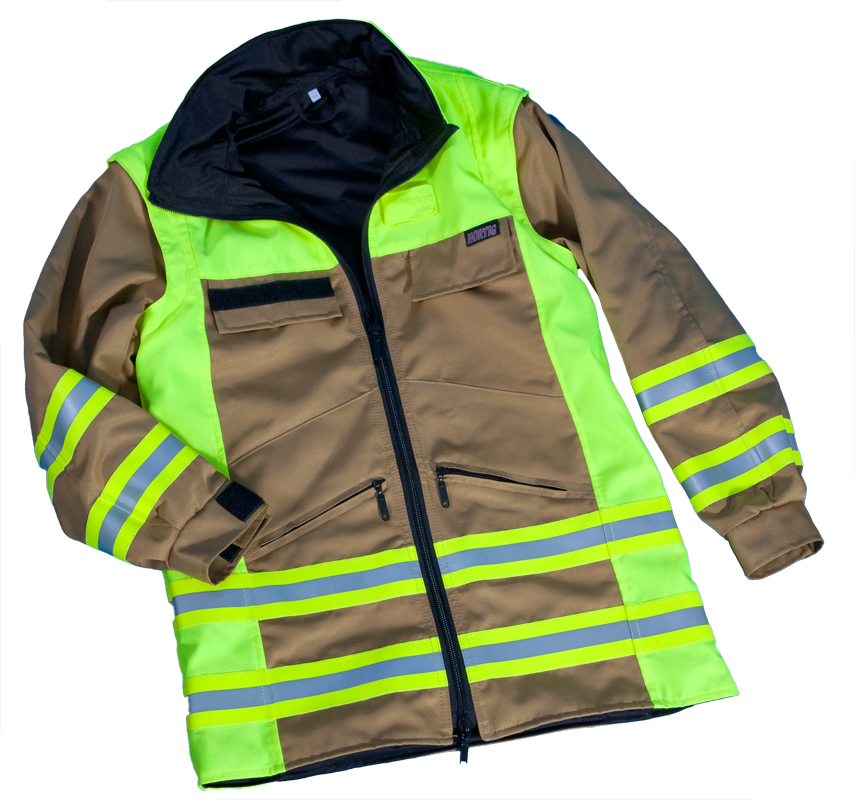 - Ausführung: beige mit neongelbem Schulterkoller und seitlichen neongelben Einsätzen