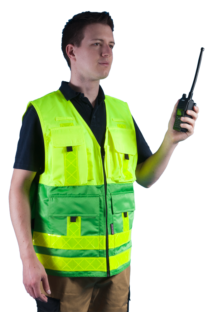 Feuerwehr-Weste grün/gelb Art. 9319/LIF, Kennzeichungsweste mit Taschen, Weste in grün/gelb, Überwurfweste mit Taschen,