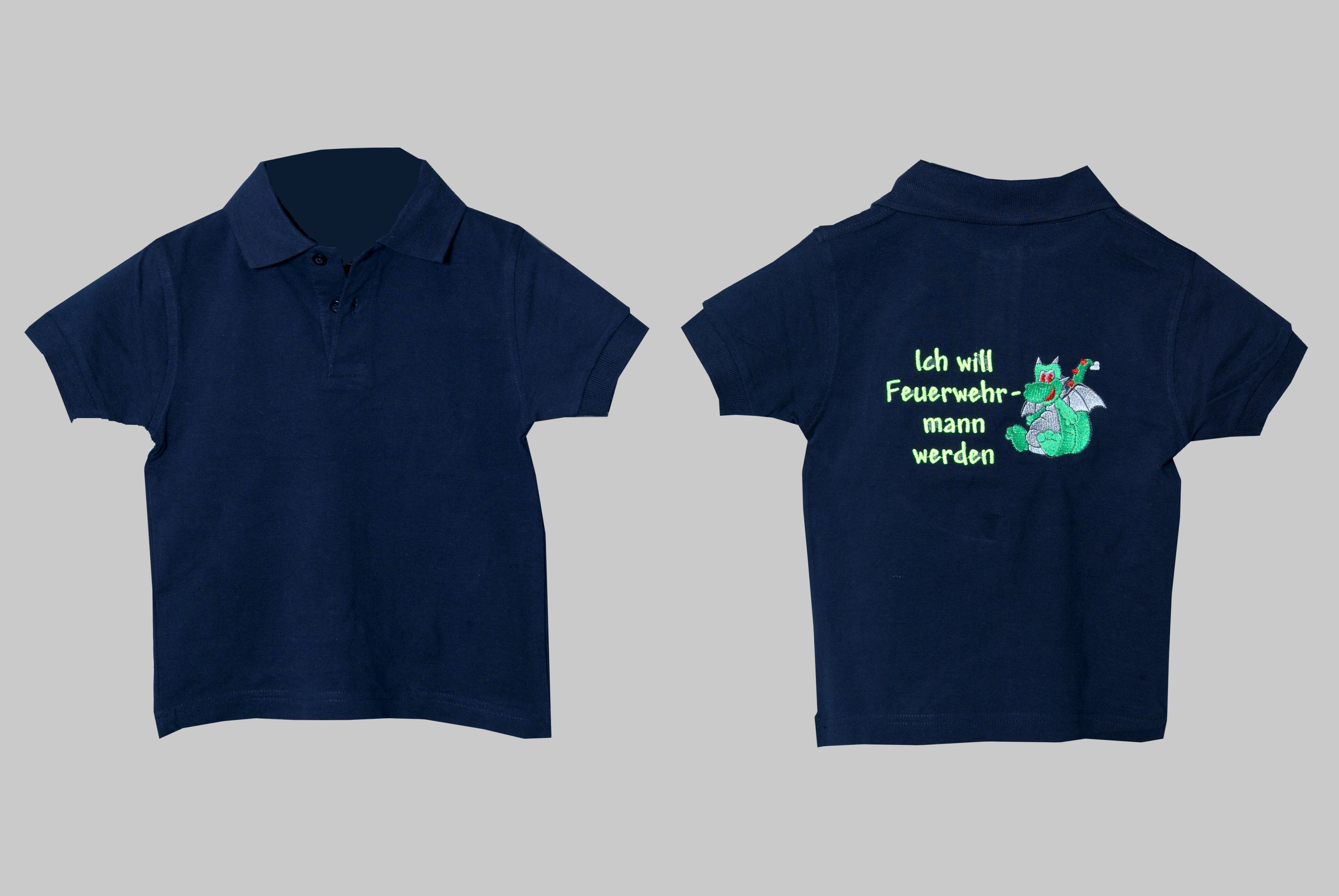 Kinder-Poloshirt blau Ich will Feuerwehrmann werden, Poloshirt für Kinder, Jugendfeuerwehr, Nachwuchsfeuerwehr, Bestickung, Drache,