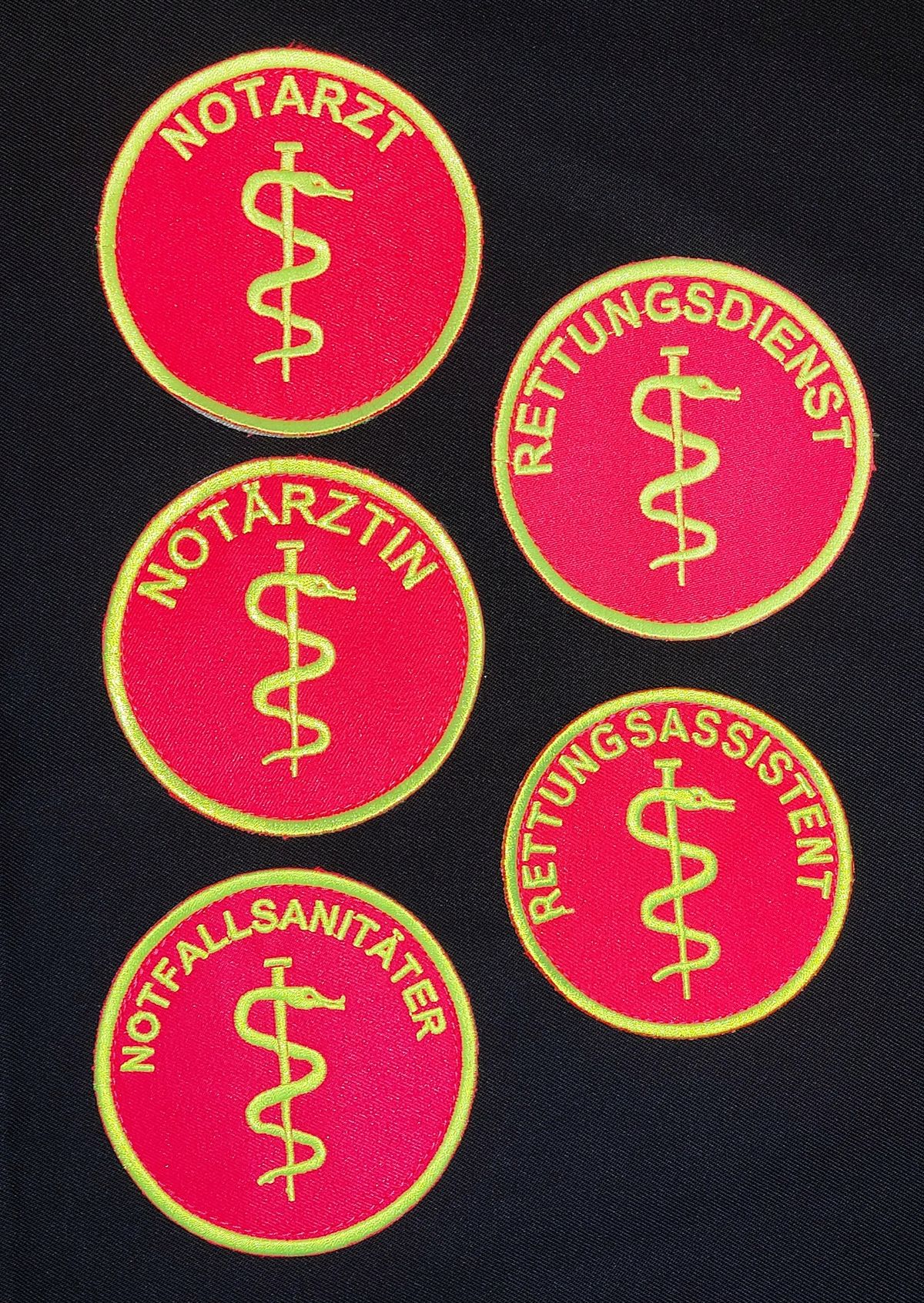 Embleme leuchtrot/gelb, gesticktes Emblem, Emblem mit Klett, Emblem zum aufnähen,