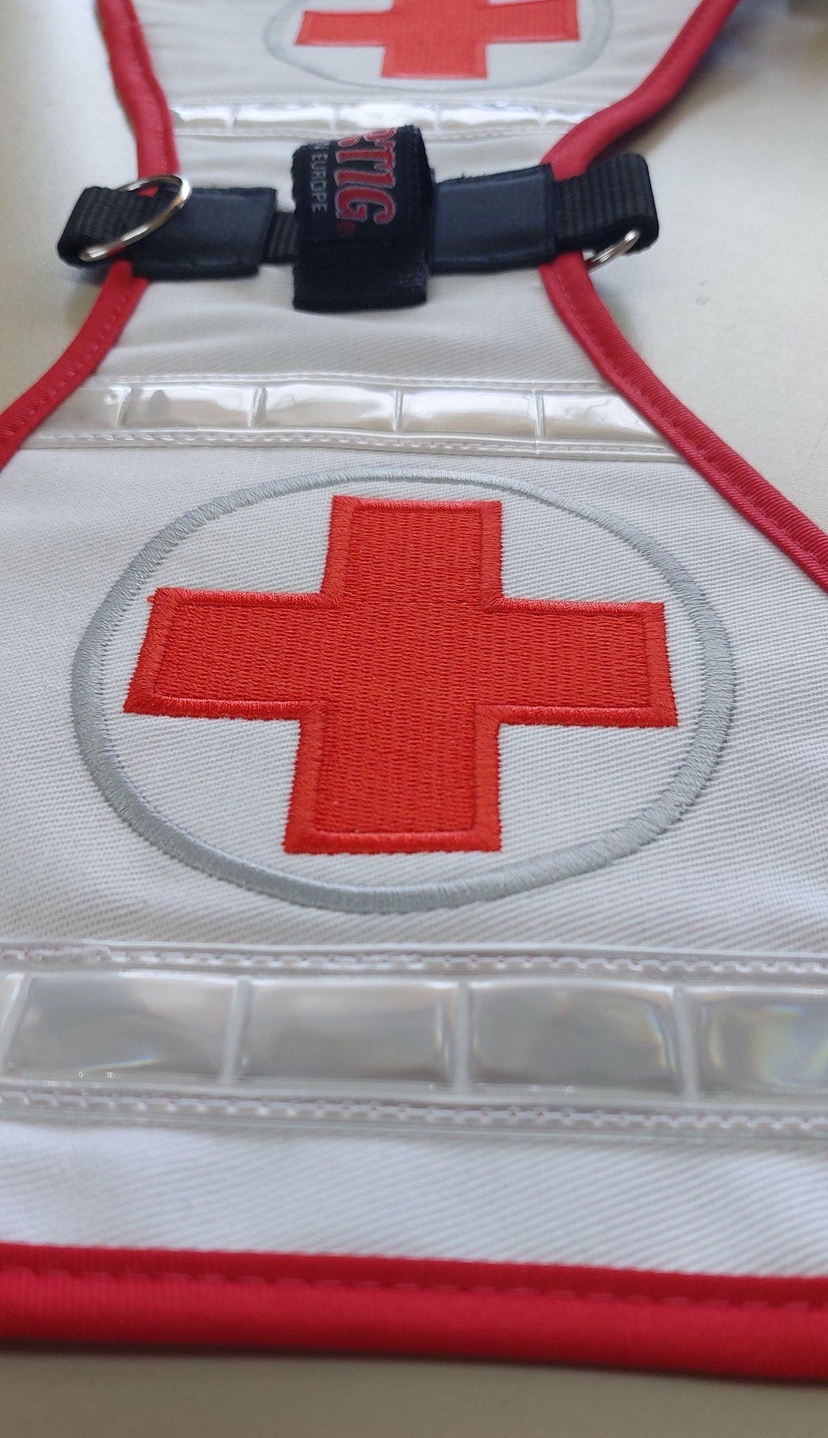 - Rotes Kreuz mit silbernem Kreis beidseitig bestickt