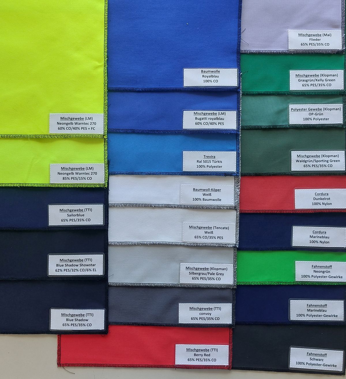 Bild 1: neongelb, bugatti royal blau, weiss, blue shadow Mischgewebe, blue shadow mit Elastan,